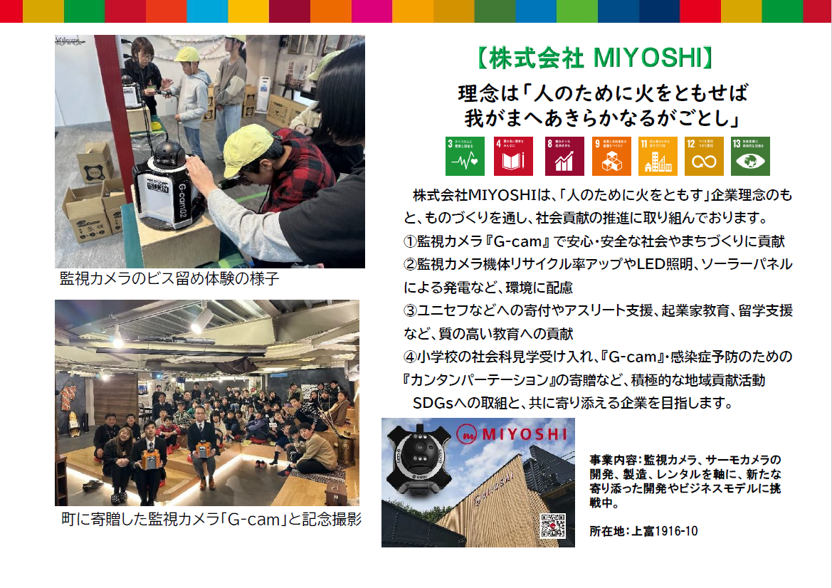 SDGsの取組として、『マゴコロランドセルプロジェクト』としてジョイセフを通じ、ランドセル68個をアフガニスタンに寄贈。社会科見学に訪れた小学生が防犯カメラの製造体験を行うなど、地域貢献活動にご協力いただいています。 また働き方改革や、平和・教育・文化・環境・福祉・スポーツの6分野に寄附をするなど、世界を見ながら活動をしている点なども評価されました。 |