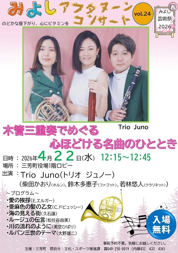 三芳町では、誰もが気軽に芸術文化に親しみ、出会うことのできる「憩いの場」をつくるため、みよしアフタヌーンコンサートを月1回程度、開催します。