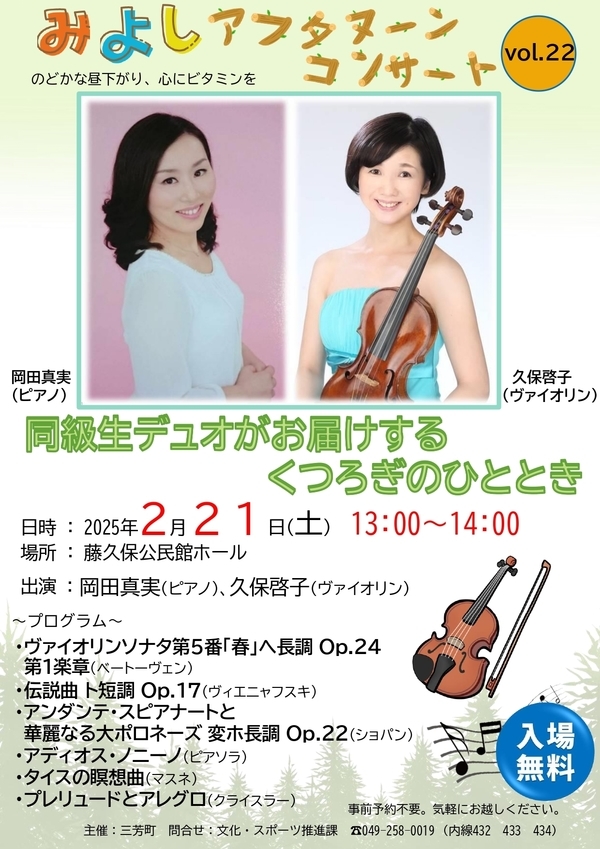 三芳町では、誰もが気軽に芸術文化に親しみ、出会うことのできる「憩いの場」をつくるため、みよしアフタヌーンコンサートを月1回程度、開催します。