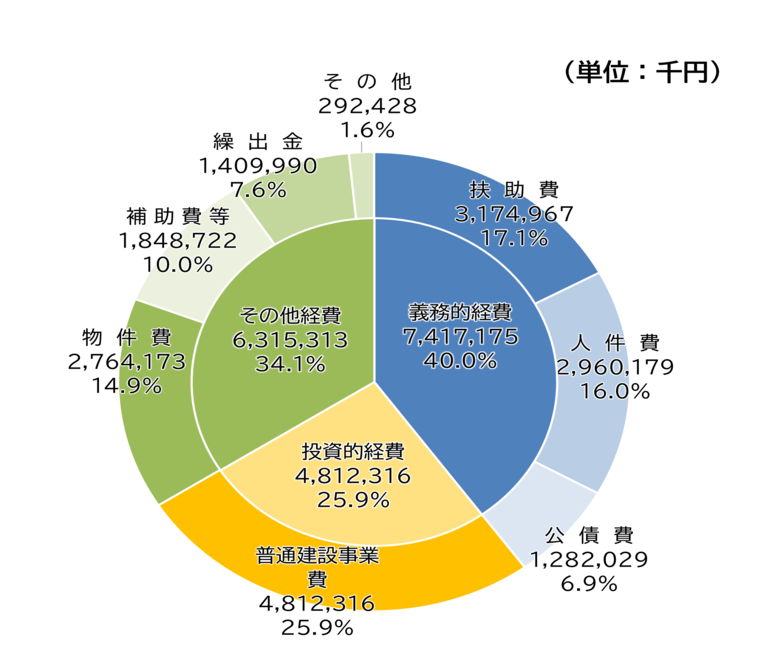 上記のグラフは、支出(歳出)の目的別割合をあらわしています。